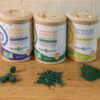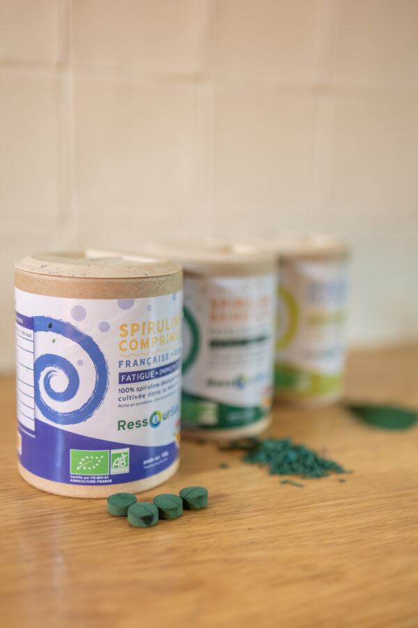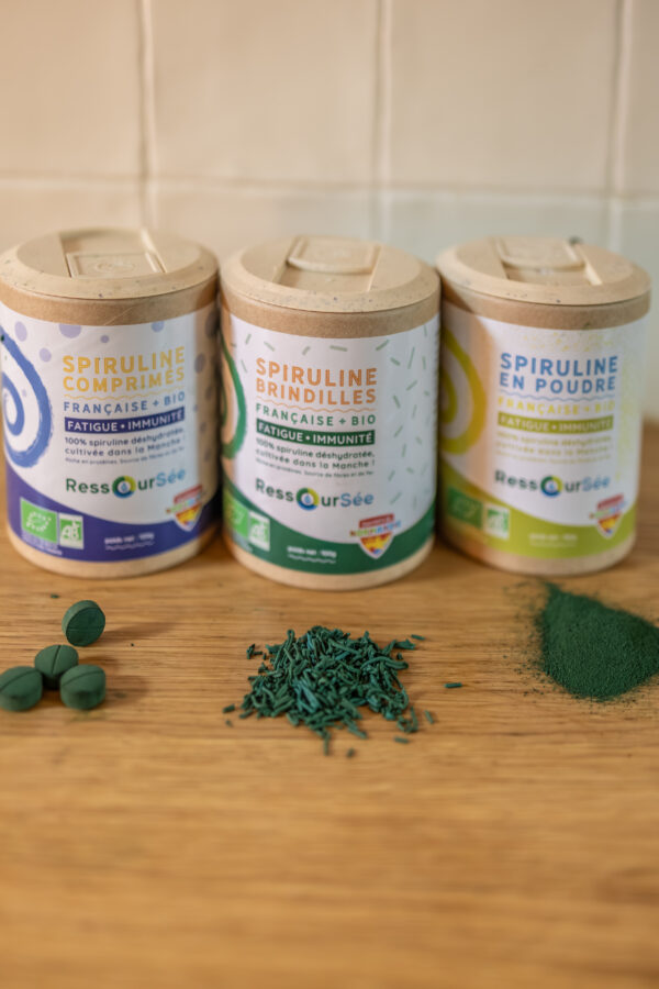 Lot de 3 articles contenant une boite de spiruline en brindilles bio, une boîte de spiruline en poudre bio et une boîte de comprimés bio. La spiruline est cultivée, déshydratée et conditionnée sur place.