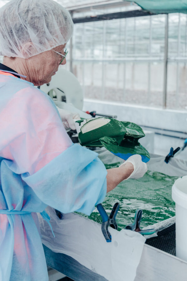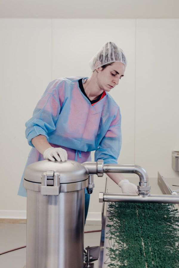 Paillettes obtenues par simple broyage après l’étape de séchage. Le séchage se fait à basse température pour préserver toutes les qualités nutritionnelles de la spiruline. La spiruline est cultivée, déshydratée et conditionnée sur place.