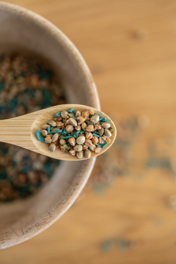 Ingrédients (composition moyenne) : Graines de sarrasin torréfiées* (40%), Graines de chanvre torréfiées* (37%), Spiruline (20%)*, Algues Wakamé* (3%)